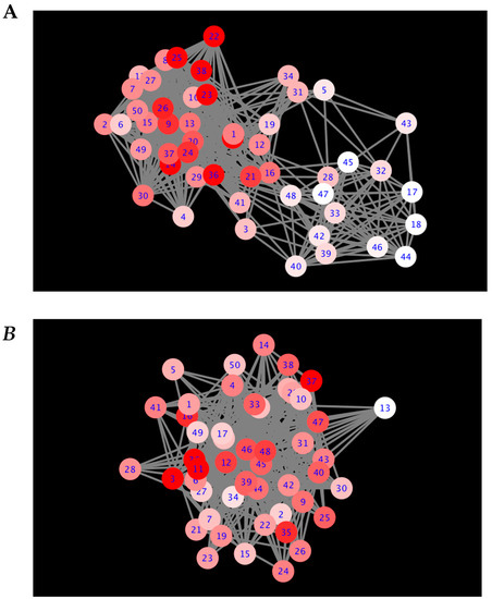 DyNet networks. The deeper the red of the node, the more rewiring has occurred. DyNet calculates the variance between each node’s connectivity between networks and computes a score based on the number of altered (i.e., added, removed) connections. Based on Pearson coefficient threshold T = 0.1 networks. (A) Positive Pearson correlation DyNet network. (B) Negative Pearson correlation DyNet network.