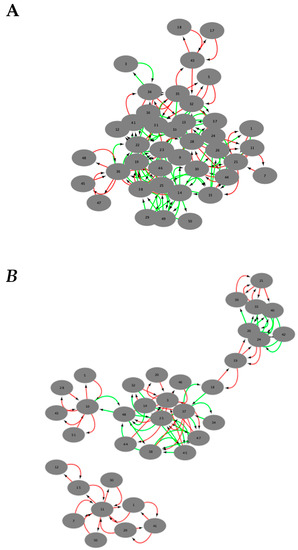 Diffany networks. Green arrows represent increase in association and red indicate decrease in association between genes (Alzheimer’s disease (AD)/MCI vs. NC). Association is determined by the addition or removal of edges between networks in comparison to a reference condition. Based on Pearson coefficient threshold T = 0.1 networks. (A) Diffany network generated from positive correlation networks. (B) Diffany network generated from negative correlation networks.