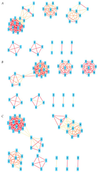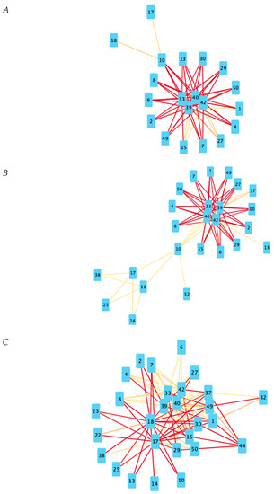 Negative correlation networks for all disease states. Red lines indicate a higher Pearson correlation coefficient. Based on Pearson coefficient threshold T = 0.3 networks. (A) Negative correlation network for NC state. (B) Negative correlation network for MCI state. (C) Negative correlation network for AD state.