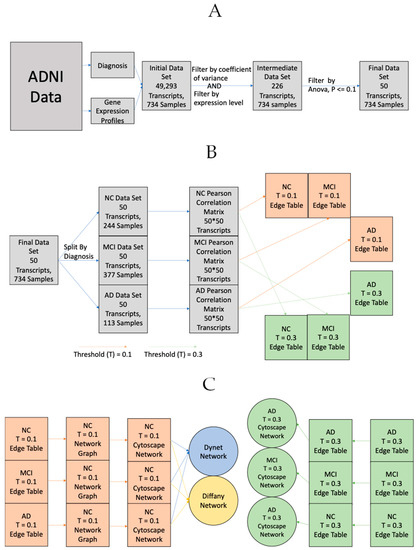 Networks were then generated in Cytoscape [46]. In order to better understand these networks, two complementary visual analysis tools were used. DyNet is a tool that compares two or more networks with the same node-set and identifies the nodes whose connections change the most between the different networks (rewired) The higher the rewiring score, the more the gene’s co-expression with other genes varies between conditions. Diffany is another tool that was used in order to compare networks that functions differently than DyNet [47]. Diffany was used to generate a directional network that visualizes how the correlations between genes changes between the normal and afflicted (MCI and AD) states. The steps from data acquisition to network creation are detailed in Figure 5 below.