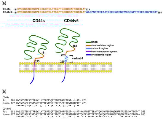 Since the CD44s and CD44v6 stem regions have not been structurally solved using X-ray crystallography or NMR imaging, we generated 3D models of these proteins by using the threading method. Long-timescale MD simulations were employed to sample their conformations. The sampled conformations were analyzed for further characterization. We termed the “CD44s stem region” the “standard stem region”, and the “CD44v6 stem region” is composed of the “standard stem region” and “variant 6 region”. The AA sequences of the standard stem region of CD44s and CD44v6 were exactly the same (Figure 1a). In previous studies, rat models were widely used in CD44-related research. Figure 1b provide the sequence comparison of human and rat. Previous studies have successfully proved the significance of CD44v6 in rat models [52,53,54]. Thus, we began our study with rat sequence.