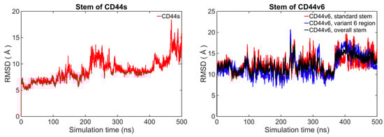 The selected models of the CD44s and CD44v6 stem regions were then energy-minimized. Subsequently, two atomistic MD simulations were performed separately for a long time duration of 500 ns on the two systems—the stem region of CD44 and the stem region of CD44v6—to explore their conformational dynamics and structural properties. The root mean square deviations (RMSDs) were monitored over a 500 ns trajectory to view the extent of conformational sampling overall. The RMSDs relative to average structure are shown in Figure 2. The RMSDs of the standard stem region for CD44s and CD44v6 both mainly ranged from 6 Å to 16 Å. A large fluctuation in the RMSD value of the backbone atoms for both cases indicated dynamic behavior of the standard stem region for both CD44s and CD44v6. Notably, no considerable variation in the RMSD of the standard stem region backbone of both CD44s and CD44v6 was observed from 330 to 470 ns.