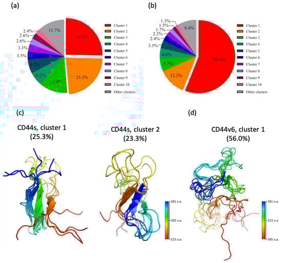 To characterize the conformational ensemble sampled using MD for detailed investigation, we performed a clustering analysis on the standard stem region in the CD44s and CD44v6 systems. In this calculation, we classified the sampled structures into distinct clusters on the basis of their RMSD values with a cutoff of 8.5 Å. The population distributions of the first 10 most populated clusters are shown in Figure 3a,b. Through this analysis, we found two predominant conformations in our simulations of the CD44s stem region, with population distributions of 25.3% (cluster 1) and 23.3% (cluster 2), which together represented approximately 50% of all conformations. In contrast, a single major conformation was detected for the CD44v6 stem region, with 56.0% (cluster 1) of the population of all conformations. The structures obtained from the clustering analysis are presented in Figure 3c,d. It is apparent that the most populated clusters of the CD44s stem region, cluster 1 and cluster 2, were both mixed with loops and β-sheet secondary structures, whereas the most populated cluster of the CD44v6 stem region, cluster 1, exhibited much less β-sheet content. A significant structural difference between cluster 1 and cluster 2 in CD44s was the β-sheet arrangement. In cluster 1, β-sheets were arranged in an antiparallel manner consisting of three β-strands. In contrast, in cluster 2, β-sheets were arranged in a parallel manner and consisted of two β-strands. These observations are in agreement with the calculation indicating that cluster 1 had a higher population than cluster 2 insofar as the antiparallel β-sheet was more abundant and energetically favored than the parallel β-sheet was [58,59]. Due to the aforementioned results, we selected the most populated clusters of the CD44s stem region (cluster 1 and cluster 2) and cluster 1 in the CD44v6 stem region for further analyses.