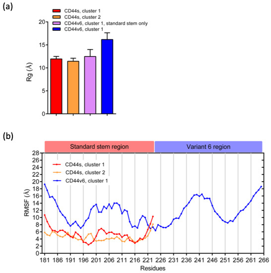 We calculated the radius of gyration (Rg) to understand the levels of compaction of the CD44s and CD44v6 stem regions. Rg is defined as the mass-weighted root mean square distance of a collection of atoms from their center of mass [60]. Therefore, this analysis could provide the overall dimensions of the protein. The Rg values of the standard stem region in CD44s and CD44v6 were quite similar and were all approximately 12 Å, as shown in Figure 4a. Although the conformational differences between CD44s and CD44v6 in the standard stem region were evident, as mentioned previously, the Rg results indicated that the v6 region did not affect the standard stem region by markedly changing its size. However, considering the overall CD44v6 stem region, we could see an increase in the Rg value to an average of 16.17 Å, as expected due to an increase in the number of AAs.