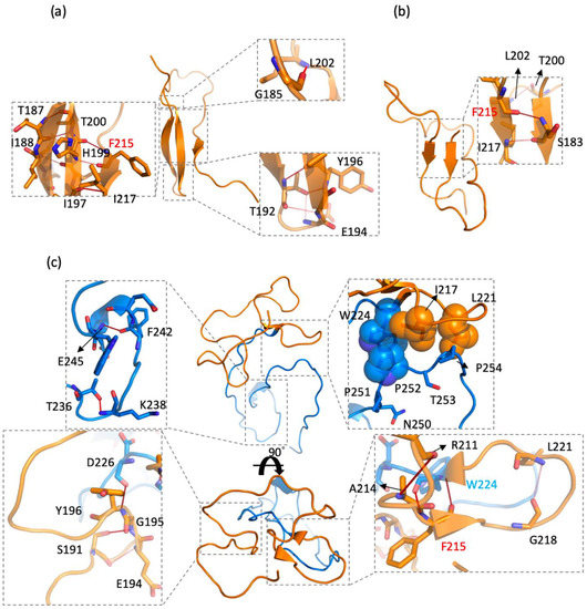 Hydrogen-bonding interactions have long been considered crucial in the stability of a protein structure [65,66]. To identify the key residues for hydrogen bonds (Hbonds), we have presented the Hbonds interaction pairs with an occupancy of >35% in CD44s and CD44v6 in Tables S1–S3. Among all of the residues, Phe215 was the only AA that formed Hbonds in CD44s and CD44v6, but with different interaction partners. The main chain of Phe215 formed persistent Hbonds with His199 (occupancy of 88.60%) in CD44s cluster 1, Ser183 (occupancy of 65.71%) in CD44s cluster 2, and Trp224 (occupancy of 75.40% and 63.10%). The strong occupancies of Phe215 in the Hbonds indicated the crucial role of the residue in stabilizing β-sheet structures, which was consistent with the aforementioned observations. Moreover, the results may suggest that Trp224 in the v6 region competed with His199 and Ser183 for the formation of Hbonds with Phe215, which caused the β-sheet structures, disrupting the standard stem region. A structural view of Hbond interactions is shown in Figure 6.