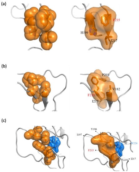 The hydrophobic and aromatic interaction network with the key residue Phe215 in (a) the CD44s stem region, cluster 1; (b) the CD44s stem region, cluster 2; and (c) the CD44v6 stem region, cluster 1. The residues involved in the hydrophobic and aromatic interactions are colored orange and are shown in sticks with spheres (left) and surfaces (right).