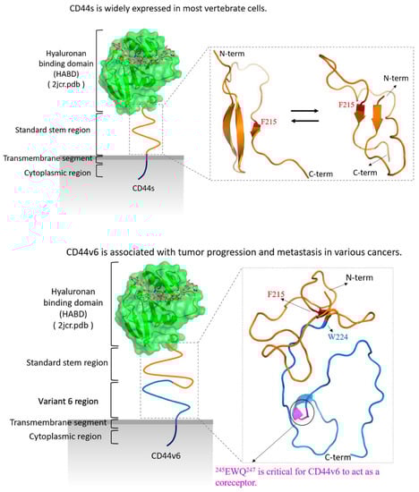 CD44 is widely expressed in most vertebrate cells, whereas the expression of CD44v6 is restricted to only a few tissues and has been considered to be associated with tumor progression and metastasis. Thus, CD44v6 has been recognized as a promising prognostic biomarker and therapeutic target for various cancers for more than a decade. However, despite many experimental studies, the structural dynamics and differences between CD44s and CD44v6, particularly in their stem region, still remain elusive. Here, a computational study was conducted to address these problems. We found that the stem of CD44s adopted predominantly two conformations, one featuring antiparallel β-sheets and the other featuring parallel β-sheets, whereas the stem of CD44v6 adopted mainly one conformation with relatively highly suppressed β-sheet contents. Moreover, Phe215 was found to be essential in the β-sheets of both CD44s and CD44v6. We finally found intramolecular Phe215–Trp224 hydrogen-bonding interactions and hydrophobic interactions with Phe215 that cooperatively drove conformational differences upon the addition of the v6 region to CD44. Our study elucidated the structural differences between the stem regions of CD44s and CD44v6 and thus can offer useful structural information for drug design to specifically target CD44v6 in promising clinical applications.