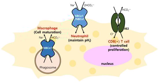 The regulation of immune cells through bicarbonate transporters. Immunological functions of NBC (NBCn1 and NBCe1) and AE2: macrophage maturation, maintenance pHi of neutrophil, and control of CD8+ T-cell proliferation.