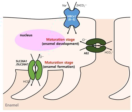 Enamel formation requires functional activity of ion transport for pH regulation. Ameloblasts in the maturation stage regulate extracellular pH to control the regulatory networks for enamel mineralization (Table 1) [102,103]. Modulation of pH fluctuation is mediated by the cyclic transformation of ruffle-ended ameloblasts and smooth-ended ameloblasts [103]. During amelogenesis, ameloblasts in maturation stage express the gene transcripts for NBCe1 isoforms B-E [104]. Mutation of NBCe1 is associated with defects of enamel development, and its expression in ameloblasts and papillary cells depends on the developmental process to modulate pH [104]. Matured ameloblasts secrete HCO3− into the forming enamel through the involvement of AE2 [105]. In addition, ameloblasts express SLC26A3, SLC26A4 (CBE), and SLC26A6, and the gene expression profile of null mice showed that SLC26A isoforms compensate their functions [105]. Moreover, SLC26A1 (CBE) and SLC26A7 (Cl−/base transporter) were also highly expressed in maturation-stage rodent ameloblasts [106] (Figure 3). SLC26A1- and SLC26A7-null mice did not exhibit abnormal enamel formation [106]. There were compensation processes of interaction units such as CFTR, CA II, CA VI, AE2, NBCe1, AE4, and SLC26A9 (epithelial Cl− channel), and thus no obvious dental phenotype was revealed [102,106]. Bronckers summarized the major types of transmembrane molecules of ameloblasts [103]. The experimental and functional evidence of transporters and pH regulation in ameloblasts or dental cells needs to be elucidated. Recently, HCO3− secretion was observed in ameloblasts from a rat cell line, HAT-7 cells, in a 2D culture system. HAT-7 cells are recommended as a useful functional model for transporters of ameloblasts [107]. Moreover, the characteristics of pH modulation in human dental pulp stem cells by NBC, NHE, AE, and Cl−/OH− exchanger (CHE) were recently addressed [108].