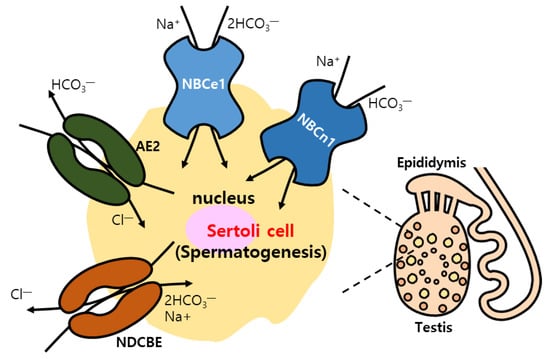 HCO3− is also critical to pH maintenance as well as ionic homeostasis in the reproduction system, including sperm production or sperm quality, male reproductive tract, and uterine epithelial cells [133]. AE2, NBCe1, NBCn1, and NDCBE were identified in sertoli cells, targets of hormonal signaling, and are associated with spermatogenesis [134,135] (Table 1 and Figure 4). Estradiol level is involved in the modulation of ion transporter expression [136,137,138,139,140]. CFTR also plays a critical role in male fertility. Age-dependent CFTR regulation correlates with sperm quality, including sperm motility. Reduced CFTR expression in sperm was observed in men with advanced age [141]. The male reproductive duct needs to maintain adequate luminal pH by modulating HCO₃− transport through DRA, SLC26A6, and CFTR, and/or H+ transport through NHE3 [133,142,143,144]. In addition, SLC26A4 and SLC26A6 were expressed in the endometrial cells and localization of SLC26A6 was dependent on the menstrual cycle [145]. The uterine fluid is affected by changes in sex steroids due to the fluctuation in pH and Na+ concentration. Estradiol-induced NBCe1-A expression was enhanced in luminal and grandular epithelial cells of uteri [146]. Recently, NBCn1 present in the apical membrane of endometrial cells was also implicated in the balance between HCO3− absorption and secretion [147] (Table 1 and Figure 5). However, in both males and females, the functional relationship between each transporter in maintenance of reproductive process needs to be elucidated more extensively.