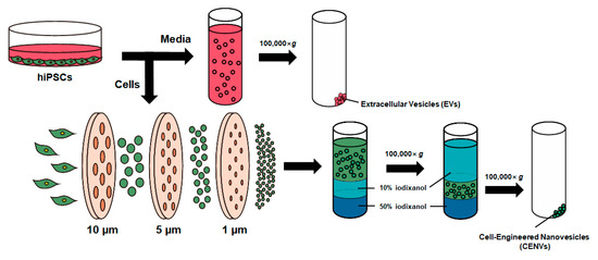 Schematic of the preparation of extracellular vesicles (EVs), and cell-engineered nanovesicles (CENVs) from human induced pluripotent stem cells (iPSCs). For iPSC-EVs preparation, spent medium conditioned by human iPSCs was collected, and subsequently ultracentrifuged for 2 h. For iPSC-CENVs preparation, cells were serially extruded through the polycarbonate membrane with diminishing pore size. Then, the generated iPSC-CENVs were collected by density-gradient ultracentrifugation using iodixanol (OptiPrep™).
