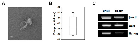 The transmission electron microscope (TEM) images and the result for dynamic light scattering (DLS) analysis demonstrated that iPSC-CENVs had a spherical morphology (Figure 2A), and the average zeta potential was −15.8 mV (Figure 2B), respectively, suggesting that the isolated iPSC-CENV is an EV-like small nanoparticle, and enclosed in a negatively charged lipid bilayer consisting of human iPSC-derived plasma membrane. It has been reported that CENVs generated from certain cell types contain their specific markers [32,33]. To compare biological contents with cells and cell-derived nanovesicles, total RNAs were prepared from human iPSCs and iPSC-CENVs, respectively, and the RNA profiles were examined. Reverse transcriptase polymerase chain reaction (RT-PCR) analysis revealed that the iPSC-CENV contains pluripotent stem cell (PSC)-specific genes (Oct4, Nanog), as well as housekeeping gene (β-actin) (Figure 2C).
