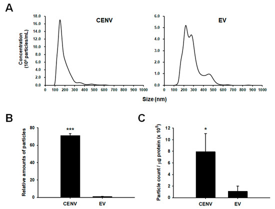 Comparison of human iPSC-derived CENV and EV. (A) Size distribution of iPSC-CENVs and iPSC-EVs, as evaluated by nanoparticle tracking analysis (NTA). (B) The number of particles isolated from the same number of human iPSCs, as evaluated by NTA. The number of iPSC-CENVs was normalized by that of iPSC-EVs, and represented as a relative value. (C) The particle-to-protein ratio of iPSC-CENVs and iPSC-EVs, indicating the relative purity against protein contaminants. Statistical significance (* p < 0.05, *** p < 0.005 compared to EVs) was determined using Student’s t-test. Error bars indicate the standard deviation of triplicate experiments.