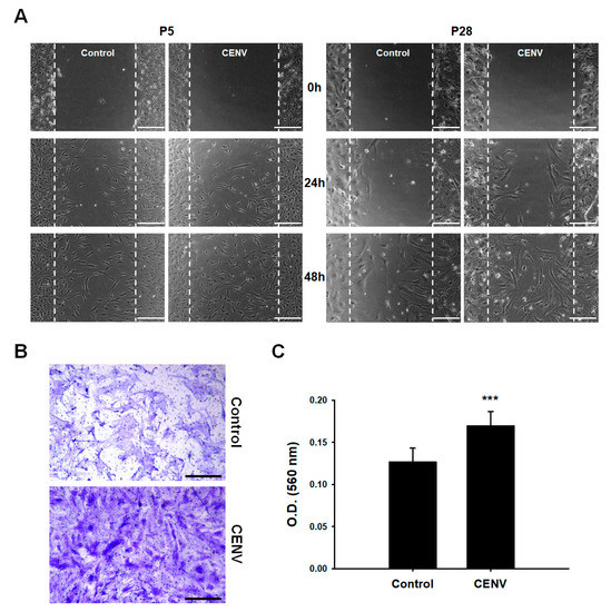 We next examined the effect of iPSC-CENV on the migration of both young and senescent HDFs. In scratch closure assay, the time-course closure of scratched area demonstrated that the rate of gap-filling was significantly higher in the case of young cells than senescent cells. However, regardless of cellular senescence, treatment with iPSC-CENVs stimulated the migration of senescent HDFs, as well as young cells (Figure 5A). In a transwell migration assay, senescent HDFs were seeded on the upper side of a trans-membrane, and the medium in the lower chamber was replaced with serum-free DMEM/F12 containing particle number 2 × 109/mL of iPSC-CENVs. The results of staining the cells that migrated to the opposite side across the porous membrane with crystal violet (Figure 5B), and quantification of the staining (Figure 5C), clearly indicated that iPSC-CENV stimulated the migration of senescent HDFs. Although the migratory potential of senescent cells was lower than that of young cells, as shown in the results of scratch closure assay, the migration-promoting effect of iPSC-CENV was comparable with the previous result of migration assays in which young HDFs were treated with the iPSC-Exo [29].