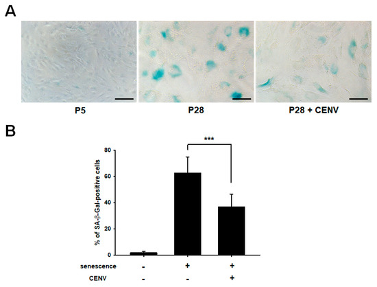 As cellular senescence progresses, somatic cells undergo diverse alterations in their phenotypic features, including flattened and enlarged morphology, limited capacity to proliferate, and several mitochondrial and metabolic abnormalities. In addition, many genetic alterations have been reported. SA-β-Gal is the most typical senescence marker, and exhibited age-dependent increase in dermal fibroblasts of skin biopsies provided from donors of different ages. Our previous study has demonstrated that the expression of SA-β-Gal was diminished by treatment with iPSC-Exo in senescent HDFs [29]. Here, we investigated whether iPSC-CENV could reduce SA-β-Gal activity in senescent HDFs. Figure 6A shows that senescent HDFs (over passage number 28, P28) expressed elevated SA-β-Gal activity, which can be visualized by staining at pH 6.0, compared to young cells (under passage number 5, P5). However, as with the previous results for iPSC-Exo, the histochemical SA-β-Gal activity was significantly reduced in the senescent HDFs by treatment with particle number 2 × 109/mL iPSC-CENVs. For quantitative analysis, the number of clearly SA-β-Gal-positive cells in each experimental group was counted from three different microscopic images with total cells, and the percentages of stained cells were evaluated (Figure 6B). While a large population of SA-β-Gal-positive cells was observed in senescent HDFs at 62.4 ± 12.4%, this population was significantly reduced by treatment with iPSC-CENVs at 36.7 ± 9.8%.