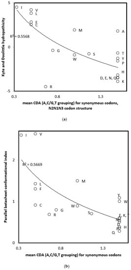 Correlations of amino acid physicochemical and structural properties with mean CDA for synonymous codons according to swapped N2N1N3 codon structure and tautomeric isoforms, from Table 2. (a) Kyte and Doolittle hydropathicity; and (b) parallel beta sheet conformational index.
