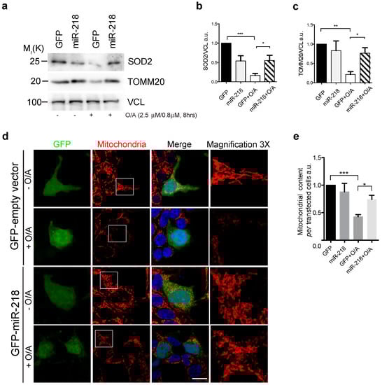Since we demonstrated that PRKN is a novel target of miR-218 in HEK293 cells (Figure 1) and since PRKN is important for a correct amplification of the PINK1-mediated mitophagy, we hypothesized here that miR-218 expression was able to interfere with mitochondrial clearance by reducing PRKN levels. To test this hypothesis, HEK293 cells transfected with GFP or GFP-miR-218 vectors were treated with oligomycin and antimycin A (O/A), two agents commonly used to induce mitochondrial damage in order to activate mitophagy [13,20]. We next checked for mitophagy occurrence; to do this, we analyzed levels of two mitochondrial proteins, a common method used to monitor mitophagy. As expected, we observed a strong decrease of both SOD2/MnSOD (superoxide dismutase 2) and TOMM20 (translocase of outer mitochondria membrane 20) following mitophagy induction, suggesting that mitochondrial clearance occurs (Figure 2a–c). However, when we overexpressed miR-218, we found no evident reduction of mitochondrial proteins upon O/A treatment, suggesting that mitochondrial clearance was blocked by miR-218 overexpression. Then, we decided to strengthen our biochemical data by performing a confocal microscopy analysis. We confirmed that miR-218 was able to inhibit mitochondrial clearance following mitophagy stimulation. In fact, in GFP-transfected cells treated with O/A, we observed a huge decrease of mitochondrial content; however, when we over-expressed miR-218, no evident decrease was observed in transfected cells (Figure 2d,e).