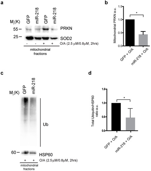Since we found that one of the main players of mitophagy pathway, PRKN, is a target of miR-218, and since this miRNA negatively controls mitochondria selective removal, we expected that miR-218 would delay mitochondrial clearance by targeting PRKN protein levels and thus affecting its known function in mitophagy. In order to address this point, we first evaluated the PRKN translocation to the mitochondria, a necessary event for a correct mitophagy induction. In fact, upon mitophagy stimulation, the cytosolic E3 ubiquitin ligase PRKN is known to be recruited to the mitochondria in order to amplify the ubiquitylation events necessary for the recruitment of mitophagy receptors [8,9,10]. To test this, HEK293 cells over-expressing GFP or GFP-miR-218 plasmids were treated with O/A in order to stimulate mitophagy. Cells were then subjected to mitochondria fractionation and immunoblotting analysis. As shown in Figure 3a,b we observed a reduction of mitochondrial PRKN comparing with the control condition following mitophagy induction. Since a reduction in PRKN mitochondrial level is evident, we hypothesized that, in the meantime, mitochondria could be less-ubiquitylated in that context. To verify this hypothesis, we transfected HEK293 cells with GFP or GFP-miR-218 constructs and we treated cells with O/A in order to induce mitophagy. We then performed a mitochondrial fractionation in which we analyzed ubiquitylation by measuring the amount of total ubiquitin in these extracts. The ubiquitylated mitochondrial proteins decreased upon miR-218 over-expression, suggesting that the PRKN-dependent ubiquitin amplification signal is reduced (Figure 3c,d).