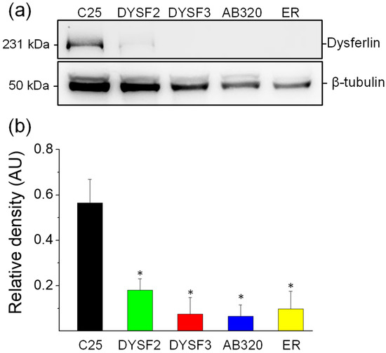 We first analyzed the relative expression of dysferlin in the cell lines DYSF2, DYSF3, AB320, and ER and compared it with the expression of the protein in C25 control myoblasts. Figure 1a shows a typical immunoblot stained with antibodies against dysferlin (upper bands) and β-tubulin (lower, loading control). Figure 1b shows dysferlin/β-tubulin ratios from five independent experiments. As compared with C25 myoblasts, the expression of dysferlin was reduced by 68%, 87%, 88%, and 83% in DYSF2, DYSF3, AB320, and ER myoblasts, respectively. These results agree with the expected dysferlin expression in these myoblasts [31,32,36,37] and validate these cell lines as in vitro models of dysferlinopathy.