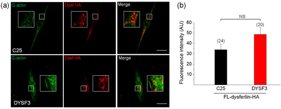 Next, we decided to evaluate whether the expression of dysferlin constructs can restore the impaired actin dynamics in DYSF3 myoblasts. We chose this myoblast cell line, and not the others, for its lower expression of dysferlin and reduced G-actin incorporation (Figure 1 and Figure 2). We first analyzed the incorporation of Alexa Fluor-labelled actin monomers in myoblasts expressing full-length dysferlin-HA. Representative images of these experiments are shown in Figure 3a. Quantification of fluorescent actin filaments in these cells shows that dysferlin-HA expression restored G-actin incorporation in DYSF3 myoblasts to levels comparable to C25 cells also expressing dysferlin-HA (Figure 3b).