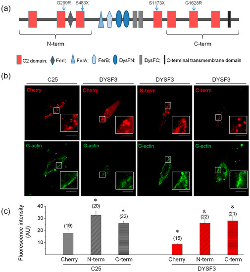 A scheme of dysferlin domains is shown in Figure 4a. Images of fluorescent actin filaments and expression of the constructs are shown in Figure 4b. Figure 4c shows quantification of fluorescent actin filaments. The analyses show that either N-terminal or C-terminal parts of dysferlin increased actin fluorescence threefold in DYSF3 myoblasts, as compared to that observed in myoblasts expressing empty mCherry (Figure 4c). Furthermore, both dysferlin regions also increased G-actin incorporation by 1.5-fold to 1.8-fold in C25 myoblasts. This strongly suggests the involvement of both dysferlin regions in actin dynamics in skeletal myoblasts.