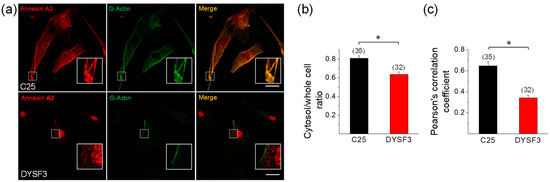 Pearson correlation coefficient analysis indicated a significant colocalization of annexin A2 with newly incorporated G-actin (0.65 ± 0.04; n = 35) in control C25 myoblasts, whereas this colocalization was lost in DYSF3 myoblasts (Pearson correlation coefficient of 0.34 ± 0.03; n = 32; Figure 5c).