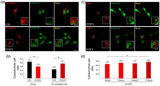 Annexin A2 distribution in DYSF3 myoblasts expressing dysferlin constructs. Distribution of annexin A2 was analyzed by immunofluorescence using an anti-annexin A2 antibody and Cy2-conjugated anti-rabbit secondary antibody in C25 and DYSF3 myoblasts expressing full-length dysferlin-HA (FL-dysferlin-HA) (a,b) and mCherry (Cherry), or dysferlin N-terminal (N-term) or C-terminal (C-term) fused to mCherry (c,d). Experiments were performed in digitonin-permeabilized cells in the presence of 10 µM free Ca2+. Confocal images were captured at the equatorial plane of the cells using identical exposure settings between compared samples; therefore, annexin A2 distribution was measured in a single focal plane. (a,c) Annexin A2 stained (green) in C25 or DYSF3 myoblasts in a mock condition or expressing FL-dysferlin-HA (a) and N-term or C-term (c). Scale bar = 20 µm. Insets show digital magnification of the boxed areas. (b,d) Data show means ± SEM of the ratio of the mean fluorescence intensity of the cytosol/whole cell of annexin A2 immunostaining. The number of analyzed cells from four different cultures is indicated in parentheses. * p < 0.05 (t-test).
