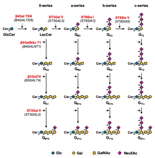 Biosynthesis pathway for gangliosides [2]. Gangliosides are synthesized by stepwise addition of monosaccharides to GlcCer. Extension of GlcCer occurs through the action of the UDP-Gal: GlcCer β1,4-galactosyltransferase to make lactosylceramide (LacCer). The action of the GM3 synthase, GD3 synthase, and GT3 synthase leads to the biosynthesis of the precursors of a-, b-, and c-series gangliosides, respectively. The 0-series gangliosides are directly synthesized from LacCer. Elongation is performed by the sequential action of β4GalNAc T1, β3Gal T4, and the sialyltransferases ST3Gal II and ST8Sia V. Genes encoding the different glycosyltransferases involved are indicated in italics between brackets.