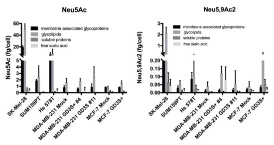 As previously described, we performed the quantification of sialic acid species in cancer cells using LC-ESI/MS analysis of DMB-Sia derivatives [12]. Our results suggest that the main O-acetylated sialic acid species expressed by these cells is Neu5,9Ac2. Here, we quantified the amounts of total sialic acid (Neu5Ac) and acetylated sialic acid (Neu5,9Ac2) in different cell fractions. Dried pellets were fractionated into membrane associated glycoproteins, soluble proteins, glycolipids, and free sialic acid before sialic acid extraction and DMB derivatization. As depicted in Figure 2, the amounts of Neu5Ac remain higher in all fractions compared to Neu5,9Ac2 levels, reaching 60 fg/cell and 3 fg/cell, respectively.
