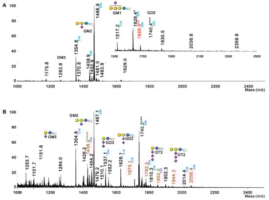 - Sugiyama, E.; Hara, A.; Uemura, K.; Taketomi, T. Application of matrix-assisted laser desorption ionization time-of-flight mass spectrometry with delayed ion extraction to ganglioside analyses. Glycobiology 1997, 7, 719–724. [Google Scholar] [CrossRef]