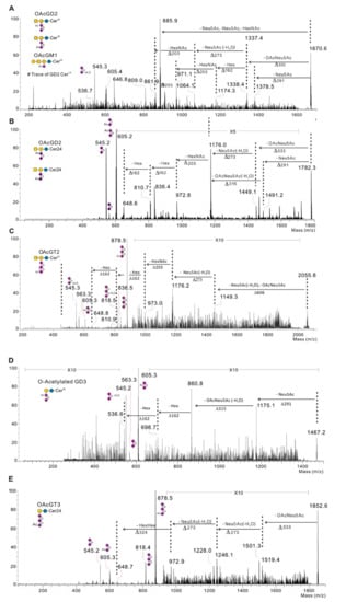 - Waki, H.; Masuzawa, A.; Kon, K.; Ando, S. A new O-acetylated trisialoganglioside, 9-o-acetyl GT2, in cod brain. J. Biochem. 1993, 114, 459–462. [Google Scholar] [CrossRef]