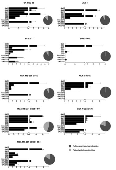 The relative amounts of the different ganglioside species were calculated by integrating the intensity of individual signals detected on MALDI-QIT-TOF mass spectra. The proportion of O-acetylated gangliosides was 1% in SUM159PT, 9% in MDA-MB-231 and MCF-7, 10% in LAN-1 and Hs 578T, and 12% in SK-Mel-28 (Figure 5). The highest amounts of O-acetylated gangliosides were observed in clones over-expressing GD3 synthase in a cell dependent manner: 18% in MDA-MB-231 GD3S+ clone #4, 22% in MCF-7 GD3S+, and 50% in MDA-MB-231 GD3S+ clone #11. In parallel, we observed that OAcGD3 was the most expressed O-acetylated ganglioside species compared to OAcGD2 and OAcGT3. OAcGD3 expression was quantified as 23.6% of total gangliosides in MDA-MB-231 GD3S+ clone #11, 9.5% in MDA-MB-231 GD3S+ clone #4, 9% in MDA-MB-231 mock, 5.9% in SK-MEL-28. OAcGD2 expression remains lower than OAcGD3 content in all cell lines.