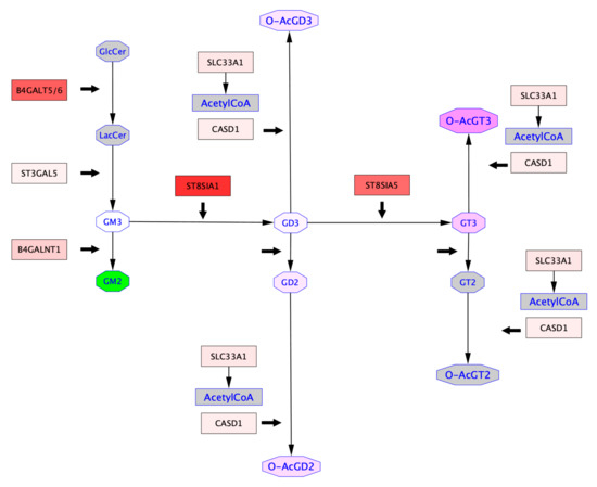 Ganglioside proportions defined by MALDI-QIT-TOF analysis were also mapped onto these pathways to represent the differential ganglioside expression in Hs 578T vs. MDA-MB-231, and in MDA-MB-231 GD3S+ vs. MDA-MB-231. The differential ganglioside expression analysis brings out the upregulation of OAcGD2 and OAcGT3 and the downregulation of OAcGD3 in Hs578T compared to MDA-MB-231. In contrast, the same analysis highlights the upregulation of OAcGT3, OAcGD3, and OAcGD2 in MDA-MB-231 GD3S+ vs. MDA-MB-231 (Figure 7). These analyses reveal the upregulation of GD3, GD2, and GT3 in both pathways. The levels of gangliosides upregulation in Hs578T vs. MDA-MB-231 are higher than those identified in MDA-MB-231 GD3S+ vs. MDA-MB-231 (Figure 6 and Figure 7). The combinatorial approach that we used allows to perceive the relationships between gangliosides expressed and GTs gene expression between two cell lines. In both cases (Hs 578T vs. MDA-MB-231, and MDA-MB-231 GD3S+ vs. MDA-MB-231), O-acetylated gangliosides appear to be upregulated independently of CASD1 expression variations between two cell lines, and in a substrate-dependent manner. O-acetylated ganglioside expression appears not only dependent on the expression level of enzymes involved in the biosynthesis of gangliosides, but also on substrate availability.