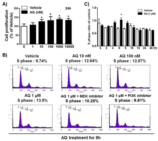 We analyzed PCNA and MCM5 levels, well-established markers of DNA replication, and cell cycle progression [52,53,54,55] by western blotting to demonstrate AQ role in stimulating proliferation and cell cycle progression (Figure 2A). After 8 h of AQ (1 μM) treatment, both PCNA and MCM5 protein levels increased significantly over 24 h (Figure 2B,C). These results indicate that AQ-stimulated cell cycle progression is accompanied by the upregulation of MCM5 and PCNA, which are essential for mitotic progression.