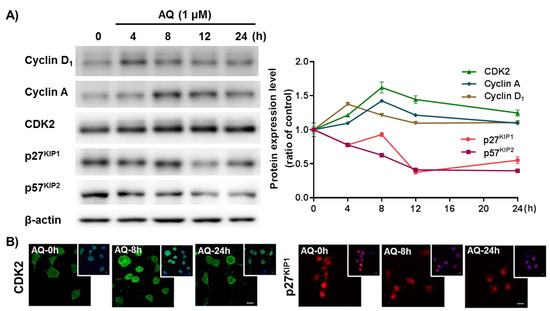 The cell cycle mechanism of AQ-mediated proliferation was evaluated in adult rat hNSCs after AQ treatment by time-dependent changes in cell cycle-related molecules. Cyclin D1 releases the E2F1 transcription factor by phosphorylating the retinoblastoma (Rb) protein to regulate cell cycle progression [59,60,61]. In addition, cyclin A accumulation during the S phase is mediated by the E2F1 transcription factor [62,63]. Furthermore, CDK2 is not only essential for cyclin D1-expressing cell survival, but also forms a cyclin A/CDK2 complex, a crucial factor necessary for cell proliferation and division [64,65,66]. These cell cycle positive modulators (cyclin D1, cyclin A, and CDK2) were analyzed after time-dependent AQ treatment by Western blotting. Cyclin D1 protein levels increased 4 h after AQ treatment. Sequentially, an increase in cyclin A and CDK2 levels were observed 8 h after AQ treatment (Figure 4A). The CDK inhibitors p27KIP1 and p57KIP1 are important negative regulators of the cell cycle for inducing cell cycle exit [67,68,69]. Time-dependent analyses of p27KIP1 and p57KIP1 protein levels in AQ-treated cells using Western blotting showed a time-dependent reduction in both proteins (Figure 4A). In addition, the progressive role of AQ in the cell cycle was confirmed by immunocytochemistry analysis of CDK2 and p27KIP1 using AQ-treated adult rat hNSCs. As shown in Figure 4A, AQ enhanced CDK2 expression and decreased the nuclear expression of p27KIP1 in adult rat hNSCs (Figure 4B). These results demonstrate that AQ treatment can promote cell cycle progression through the regulation of cell cycle-related molecules in adult rat hNSCs.