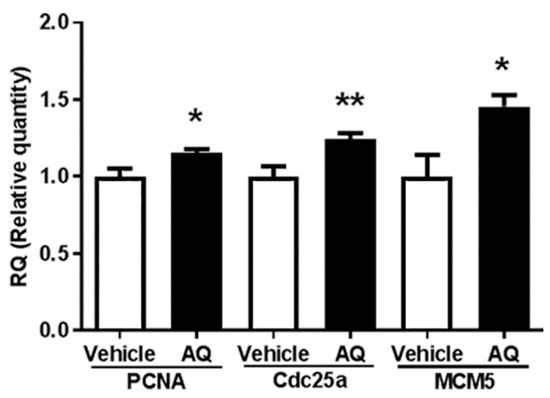The in vivo effect of AQ on cell cycle progression was investigated by evaluating the expression of the cell cycle-dependent genes PCNA, Cdc25a, and MCM5 in the brains of AQ-administered mice by RT-qPCR. Similar to PCNA and MCM5, Cdc25A was shown to be a critical regulator of G1 to S phase transition during cell cycle progression [70,71]. The expression of PCNA, Cdc25a, and MCM5 in the AQ-administered mice increased significantly compared to that in the vehicle-administered mice (Figure 5). These results are consistent with the above in vitro results.