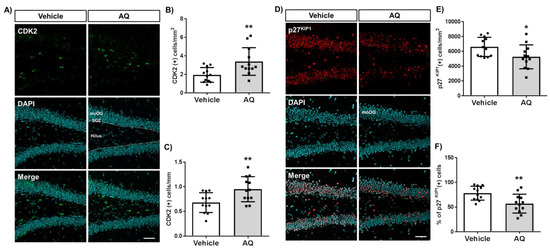 We investigated whether the observed in vitro changes in cell cycle molecules were also present in the AQ-administered mice hippocampi by immunohistochemical staining of the cell cycle positive regulator CDK2 (Figure 6A) and negative regulator p27KIP1 (Figure 6D). The number of CDK2-positive cells per hilus area in the DG increased significantly in AQ-administered mice (Figure 6B). In addition, the number of CDK2-positive cells per length of SGZ increased substantially after the AQ administration (Figure 6C). In contrast, the number of p27KIP1-positive cells per molecular layer area of DG (moDG) in the hippocampus decreased significantly in AQ-administered mice (Figure 6E). Furthermore, the percentage of p27KIP1-positive cells from the DAPI-stained cells in DG decreased significantly after AQ administration (Figure 6F). These results demonstrate, for the first time, that the administration of AQ promotes cell cycle by positively modulating cell cycle-related molecules, such as CDK2 and p27KIP1, in the DG of the hippocampus.