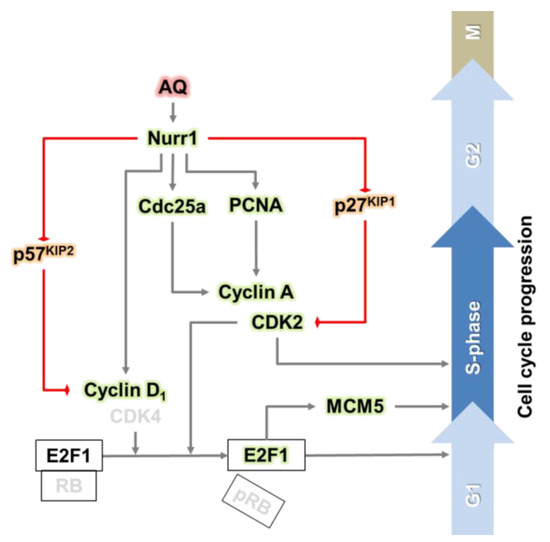 Consistent with the above results, AQ upregulated both Nurr1 and E2F1 expression, and the siRNA silencing of Nurr1 abolished this effect (Figure 3). E2F1 transcription factor interacts directly with the cyclin A-CDK2 complex to regulate the cell cycle and is significant for the G1 to S phase transition of cell cycle progression [42,81,82]. Moreover, MCM5 transcription, negatively regulated by p53, is controlled by E2F1 [53]. Therefore, increased MCM5 expression levels after AQ treatment could result from the upregulation of E2F1, which may be dependent on Nurr1 expression.