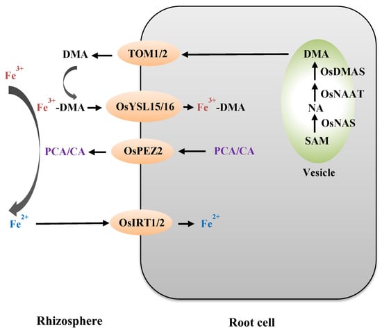 A simplified model of Fe uptake from the rhizosphere in rice. Rice not only synthesizes DMA in roots to chelate Fe3+ but also acquires Fe2+ through transporters OsIRT1 and OsIRT2. During the synthesis of DMA, there are three sequential enzymatic reactions catalyzed by the enzyme, OsNAS, OsNAAT, and OsDMAS. The TOM (transporter of mugineic acid family phytosiderophores) and OsYSL transporters are required for Fe uptake from the rhizosphere. OsPEZ2s are phenolic efflux transporters responsible for the transport of protocatechuic acid/caffeic acid (PCA/CA). The root cell is shown in the grey rounded rectangle. The vesicle is shown in the light green ellipse. Transporters are shown in the light orange ellipses.