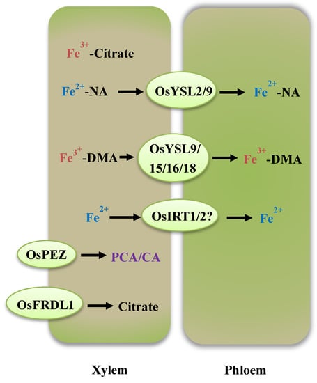 Once absorbed at the root’s surface, Fe is radially transported across the root epidermis, cortex, and pericycle to reach the xylem parenchyma cell, where Fe is unloaded into the xylem vessels by Fe transporters [8,65]. Due to its low solubility and toxicity to cells, Fe needs to be complexed with a suitable chelator within the plant body. Citrate [66,67], NA [68], and MAs [37] are demonstrated to be the main chelators that bind Fe in plants. Citrate plays a dominant role in the chelating and trafficking of Fe in xylem sap in some plants, such as soybean, tomato, rice, and Arabidopsis [66,69]. In recent years, the transporters of citrate have been identified. By analyzing the Arabidopsis mutant, frd3, AtFRD3, a member of the multidrug and toxic compound extrusion (MATE) family, was shown to play an important role in xylem Fe transport. Compared with wild-type plants grown on Fe-sufficient media, an frd3 mutant grown under identical conditions exhibits chlorotic leaves and a significant reduction of citrate and Fe in the xylem exudate. Furthermore, the phenotypes of frd3 mutants can be rescued when grown on citrate-supplemented media. These results suggest that AtFRD3 is involved in loading citrate in the xylem. OsFRDL1, an AtFRD3-like gene in rice, encodes a citrate effluxer that is specifically expressed in root pericycle cells [38,70]. The expression of OsFRDL1 shows no obvious responses to Fe deficiency treatment. Osfrdl1 mutants exhibit Fe deficiency-induced chlorosis due to lower Fe concentrations in their leaves, and the amounts of citrate and ferric iron in the xylem sap of osfrdl mutants was also less than the amounts in the wild-type rice [70]. When grown under Fe-deficient conditions, osfrdl mutants contain much greater Fe concentrations in their roots compared to wild-type rice [70]. Using the Perls blue staining method, Fe3+ was observed to deposit in the root stele of osfrdl mutants [70]. At the stage of reproduction, Yokosho et al. reported that OsFRDL1 shows significant expression in the upper nodes of rice plants. The pollen viability and grain yield of the Osfrdl1 mutant was reduced, which may be accounted for by the enhanced Fe precipitation in node I and the impaired distribution of Fe to the panicles [71]. These results suggest that OsFRDL1 functions during the translocation of Fe from roots to shoots in the period of vegetative growth, as well as during the distribution of Fe to panicles at the period of reproduction (Figure 2). To solubilize the deposited apoplasmic Fe, various phenolics, including PCA and CA, are extruded in plants [39,40]. In rice, OsPEZ1 and OsPEZ2 are identified as two phenolic efflux transporters (Figure 2). These two transporters can facilitate loading phenolics into the xylem, thus prompting the utilization of deposited apoplasmic Fe from root surfaces into the stele. Overexpression of OsPEZ1 leads to Fe toxicity phenotypes, as evidenced by severely reduced growth and leaf-tip necrosis, which are attributed to the increased contents of Fe in plants body under Fe-replete conditions [39,40]. ospez1/2 mutants have higher amounts of apoplasmic Fe in roots, thereby exhibiting a greater tolerance to Fe-deficient conditions than wild-type rice plants [39,40].