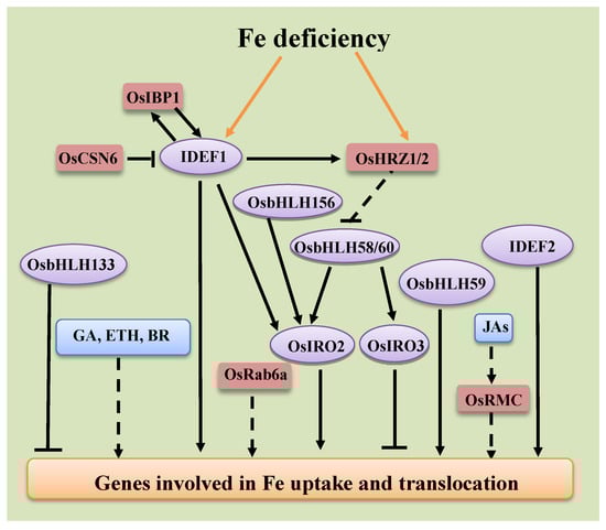The regulatory networks of the genes involved in Fe uptake and translocation in rice roots. Transcription factors are shown in light purple ellipses. Other regulatory proteins are shown in pink rounded rectangles. Hormones and signaling molecules are shown in light blue rounded rectangles. The genes involved in Fe uptake and translocation are shown in light orange rounded rectangles. Positive regulation is indicated by black arrows. Negative regulation is indicated by black blunt arrows. Broken lines indicate regulation with unknown mechanisms. Orange lines indicate that Fe signals are sensed by IDEF1, OsHRZ1, and OsHRZ2.