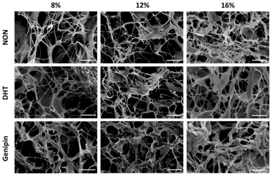 Menisci were pulverized to generate MDM powder that was reconstituted to generate 8%, 12%, and 16% MDM scaffolds. These scaffolds were then either left non-cross-linked, or were DHT or genipin cross-linked. We used scanning electron microscopy to visualize the architecture of the scaffolds. There was an apparent increase in ECM components with increasing MDM percentage (Figure 1). As well, genipin cross-linking resulted in thicker aggregates of ECM components. Overall, the MDM scaffolds maintained a porous structure, which could facilitate cell migration into the scaffolds.