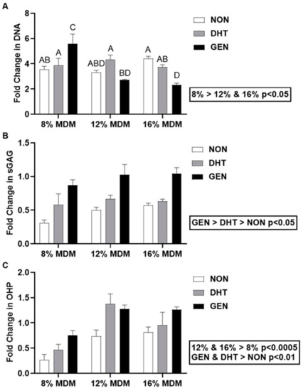 Meniscus cell-seeded MDM scaffolds were harvested at days 0 and 14, and biochemical analyses were performed. Fold changes in DNA, sulfated glycosaminoglycan (sGAG), and collagen content were determined by normalizing the day 14 biochemical properties to corresponding day 0 meniscus cell-seeded scaffold properties. The 8% MDM scaffolds had a significantly higher change in DNA content as compared to both the 12% and 16% MDM scaffolds (Figure 2A, p < 0.05). The 8% genipin cross-linked scaffolds showed the greatest increase in DNA content (p < 0.05). In contrast, the 16% genipin cross-linked scaffolds showed the lowest change in DNA content (p < 0.05), except when compared to 12% non-cross-linked and 12% genipin cross-linked scaffolds. There was no significant effect of cross-linking on fold change in DNA content. Importantly, all of the MDM scaffolds increased DNA content from day 0 (day 0 = 1). The type of cross-linking significantly affected the sGAG content of meniscus-seeded MDM scaffolds. Genipin cross-linked scaffolds had the greatest change in sGAG content (Figure 2B, p < 0.0005), while non-cross-linked scaffolds had the least change (p < 0.05). At day 0, the 12% and 16% scaffolds had significantly higher sGAG content than the 8% scaffolds. However, there was no effect of MDM percentage on fold change in sGAG content. The 12% and 16% MDM scaffolds had a greater increase in collagen content than the 8% MDM scaffolds (Figure 2C, p < 0.0005). On the other hand, non-cross-linked scaffolds had the lowest change in collagen content as compared to both the DHT and genipin cross-linked scaffolds (p < 0.01).
