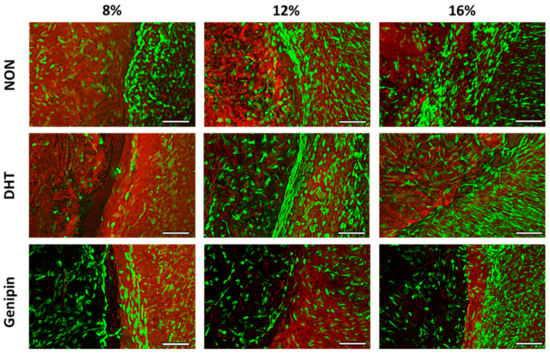 We performed fluorescence imaging to visualize live cells and ECM at the interface between the MDM scaffolds and the meniscus tissue (Figure 3). Native meniscus cells predominantly filled the interface between the meniscus tissue and the MDM scaffolds. However, in the 8% scaffolds, fewer cells were noted in the interface. In all of the MDM scaffolds, native meniscus cells from the outer tissue ring migrated into the MDM scaffolds. Fewer meniscus cells appeared to have infiltrated the 12% and 16% genipin cross-linked scaffolds as compared to the corresponding non-cross-linked and DHT cross-linked scaffolds.