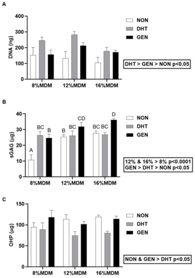 Following culture and push-out testing, MDM scaffolds were digested in 1 mL of 125 µg/mL papain (Sigma–Aldrich) digestion buffer (0.1M sodium phosphate monobasic monohydrate (Sigma–Aldrich), 5 mM ethylenediaminetetraacetic acid (EDTA; Sigma–Aldrich), 5 mM cysteine hydrochloride (Sigma–Aldrich), pH. 6.5) at 65 °C overnight [18,19,23,62,63]. DNA content was assessed using the Quant-iT Pico-GreenTM assay kit (Invitrogen). sGAG content was determined using the dimethylmethylene blue (DMMB) assay with chondroitin sulfate standards isolated from bovine trachea (Sigma–Aldrich) [18,19,62,63,64]. Collagen content was determined by the amount of free OHP produced from alkaline hydrolysis. Colorimetric analysis of OHP was determined following oxidation with chloramine-T (Sigma–Aldrich) and chromophore formation from addition of 4-(Dimethyl-amino)benzaldehyde (Ehrlich’s reagent; Sigma–Aldrich) using trans-4-hydroxyproline (Sigma–Aldrich) as standards [18,19,62,63,65].