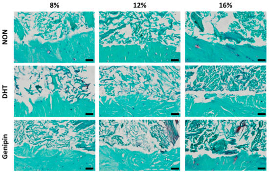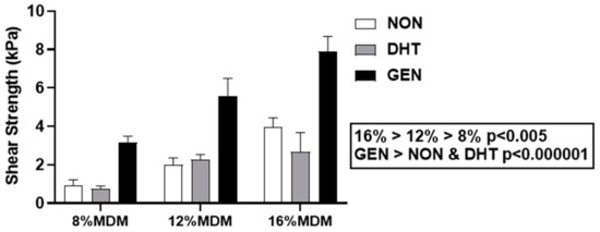 Push-out testing was used to quantify the integrative shear strength of repair [18,19,33,34,35,36,37,38,39] between the MDM scaffolds and meniscus tissue after 14 days in culture. The integrative shear strength of repair increased with the concentration of MDM in the scaffolds, such that 16% > 12% > 8% (Figure 5, p < 0.005). There was also a significant effect of cross-linking, revealing that the genipin cross-linked scaffolds had the highest shear strength of repair compared to both the non-cross-linked and DHT cross-linked scaffolds (p < 0.000001). The shear strength of repair for the native meniscus tissue control (meniscus tissue inner core and outer ring) was 5.3 ± 1.5 kPa (mean ± SEM).
