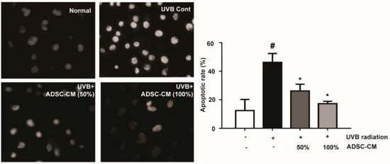 The effects of ADSC-CM on UVB-induced apoptosis of normal human dermal fibroblasts (NHDF) cells, as determined by Hoechst 33258 staining. Magnification scale: 400×. Apoptotic rate was calculated as the percentage of apoptotic cells over the total cell numbers in five randomly selected areas. Values are shown as mean ± SD. # p < 0.05, compared with the non-irradiated control. * p < 0.05, compared with the irradiated, ADSC-CM free control.