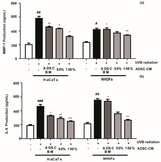The effects of ADSC basal medium (ADSC-BM) and ADSC-CM on UVB-induced MMP-1 (a) and IL-6 (b) production. HaCaTs and NHDFs were treated with 100% ADSC-BM or 50% or 100% ADSC-CM, UVB-induced MMP-1 secretion and IL-6 biosynthesis were determined by enzyme-linked immunosorbent assay (ELISA). Values are shown as mean ± SD. # p < 0.05, ## p < 0.01, and ### p < 0.001, compared with the non-irradiated control. * p < 0.05, ** p < 0.01, and *** p < 0.001, compared with the irradiated, ADSC-CM free control.
