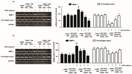 The effects of ADSC-CM on the mRNA expression of MMP-1 and procollagen type I in HaCaTs and NHDFs. HaCaTs (a) and NHDFs (b) were irradiated with UVB followed by treatment with 50% or 100% ADSC-CM for 24 h, respectively. All data are shown as the mean ± SD of at least three independent experiments. # p < 0.05 and ## p < 0.01, compared with the non-irradiated control. * p < 0.05, ** p < 0.01, and *** p < 0.001, compared with the irradiated, ADSC-CM free control.