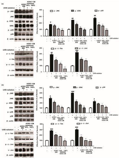 The effects of ADSC-CM on UVB-induced activation of MAPK/AP-1 signaling. HaCaTs (a) and NHDFs (b) were irradiated with UVB, followed by treatment with 50% or 100% ADSC-CM for 1 h and 4 h, respectively. The phosphorylation levels of ERK, JNK, p38, c-Jun, and c-Fos were measured by western blotting. The results are shown as the mean ± SD of at least three independent experiments. # p < 0.05, ## p < 0.01, and ### p < 0.001, compared with the non-irradiated control. * p < 0.05, ** p < 0.01, and *** p < 0.001, compared with the irradiated, ADSC-CM free control.